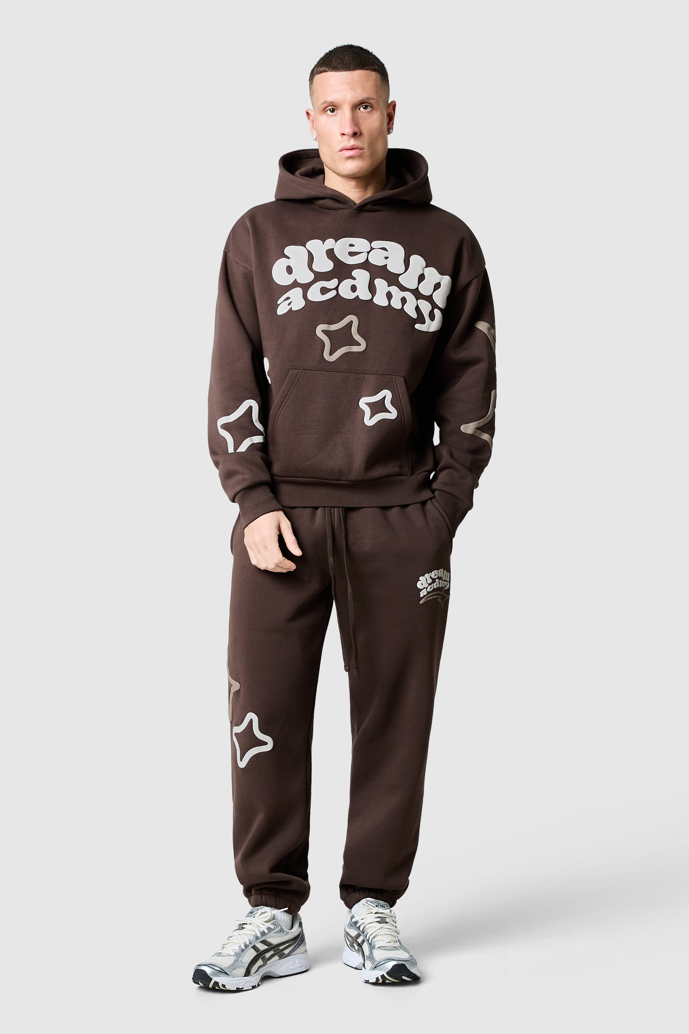 A relaxed jogger designed for comfort with modern graphic detailing. The Dream Acdmy Joggers are crafted from 80% cotton, 20% polyester brushback sweat (320 GSM) for a soft, structured feel, featuring a flat-knit cotton drawcord at the waistband. Puff print graphics on the front add a statement finish.