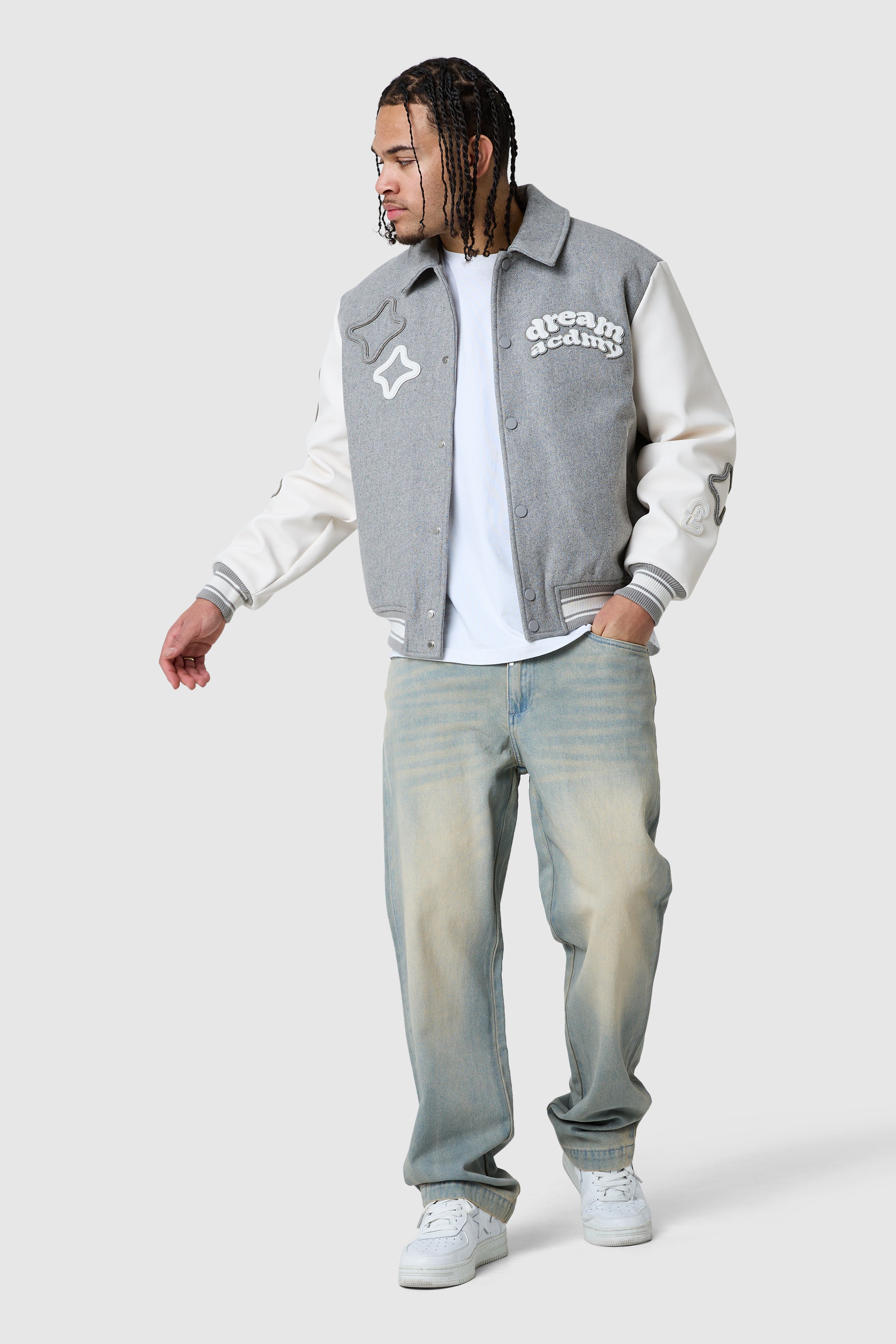 The Dream Acdmy Varsity Jacket is crafted from 47.5% wool, complemented by PU sleeves and wool appliqué patches for a modern, textured finish. Designed with a relaxed drop shoulder and jetted pockets, it combines classic varsity styling with elevated streetwear.