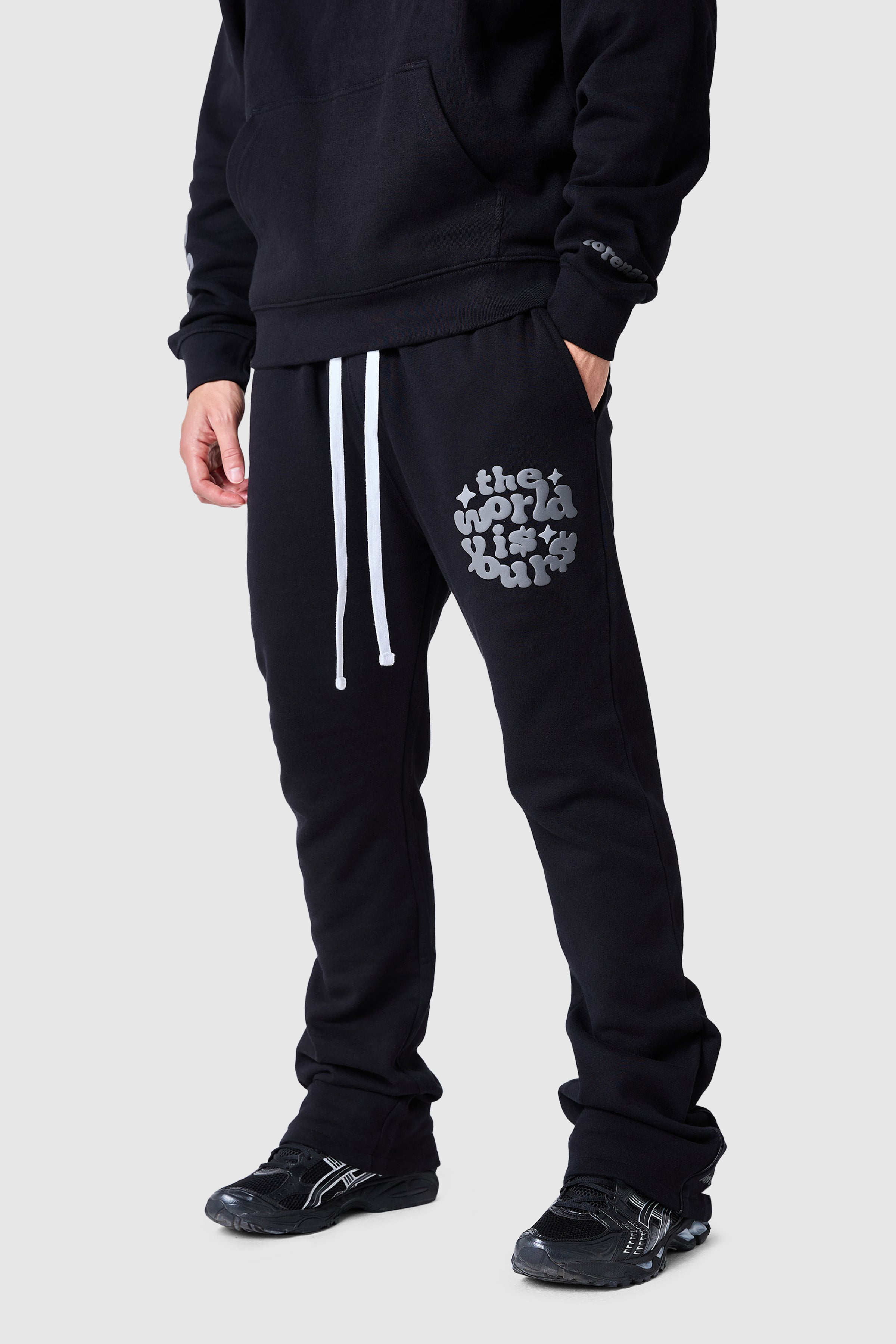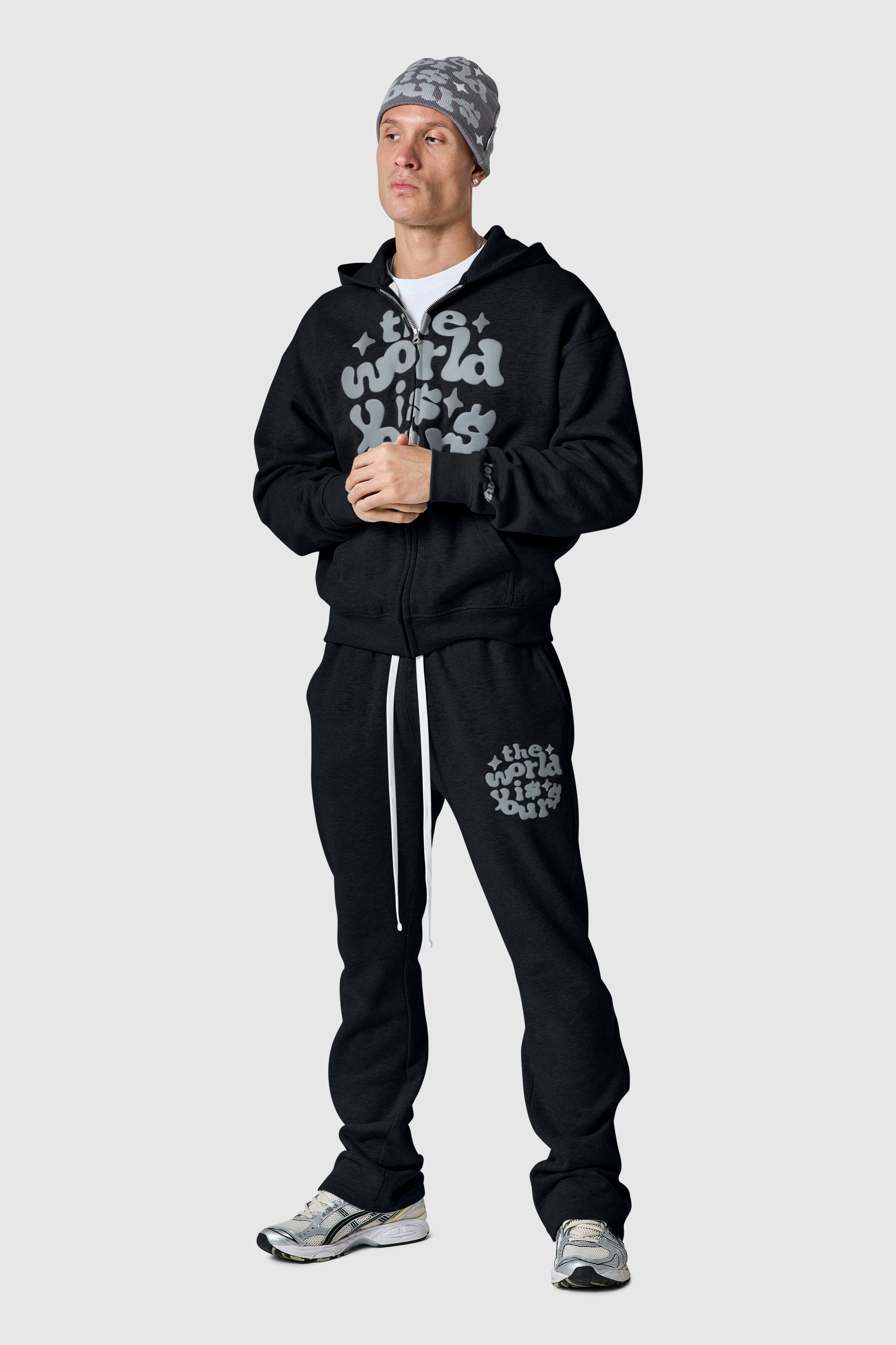 Designed for all-day comfort, the World Is Yours Zip Tracksuit features a relaxed zip hood and flared jogger silhouette. With striking graphic prints and premium fleece construction, this set delivers laid-back confidence with streetwear edge. Style together for a full look or separately to elevate your everyday fits.