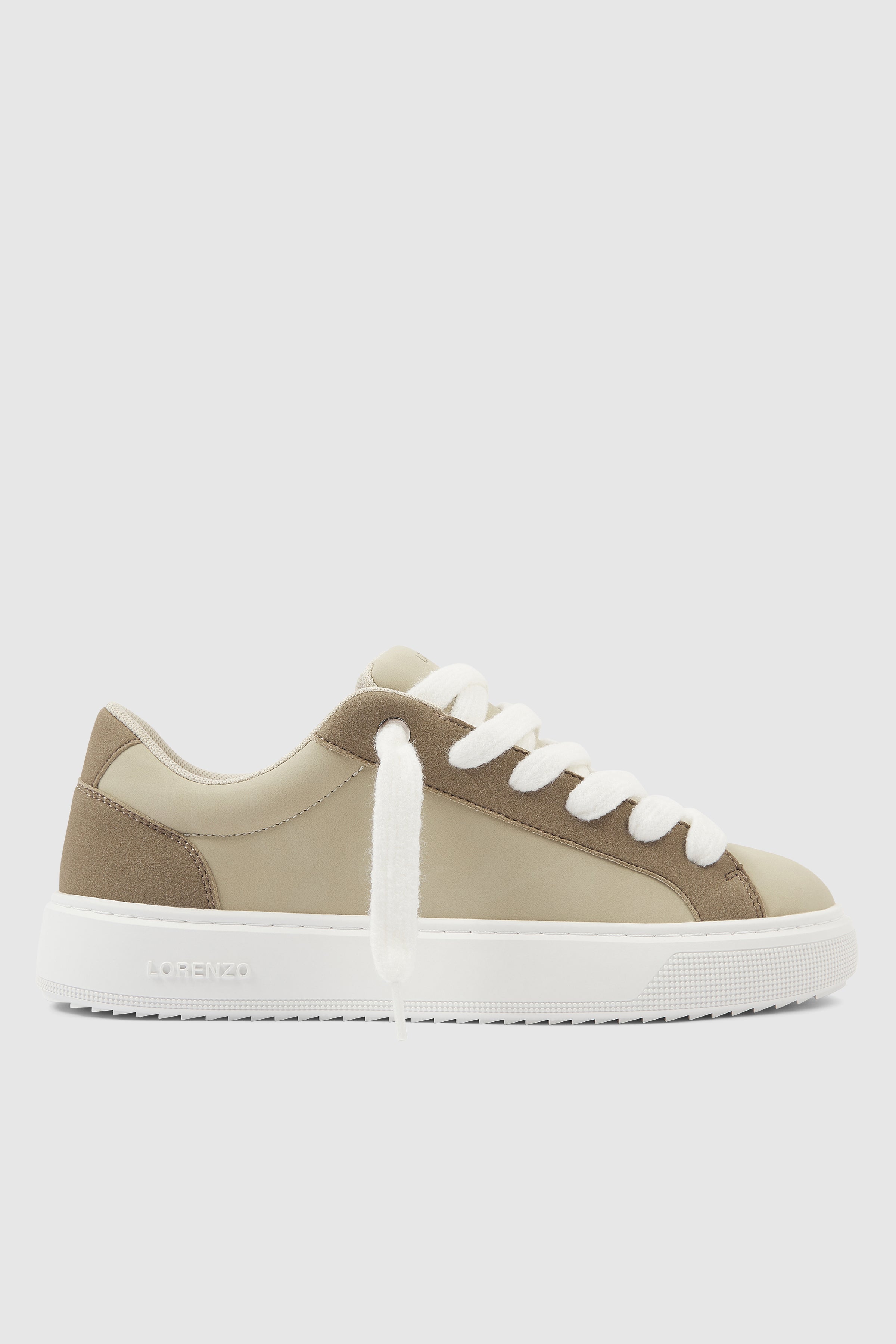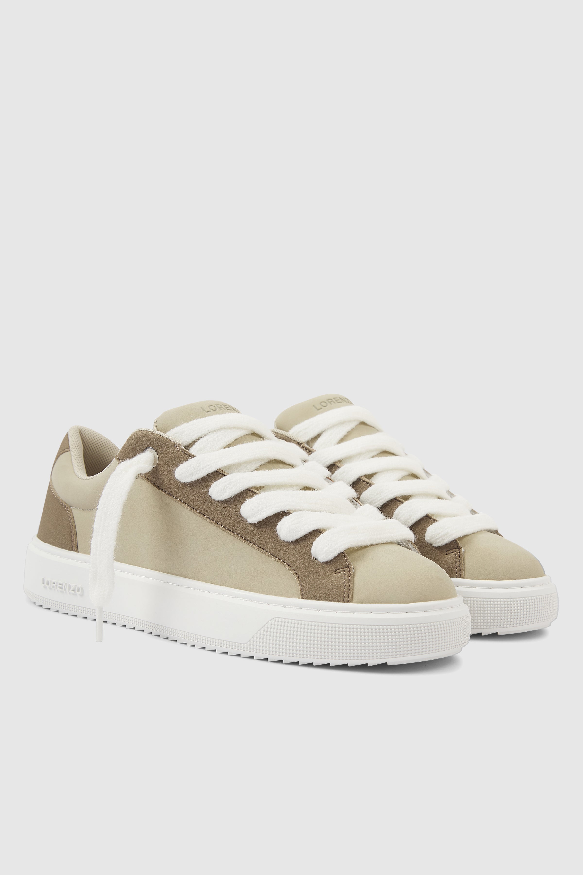 A modern low-profile trainer designed with a relaxed, fashion-led feel. The Gatto Trainer in Sandstone features immi suede overlay panels, creating a soft, textured finish with added depth. Layered paneling and tonal contrasts define the silhouette, while the open-lace styling gives the design an effortless, laid-back edge.