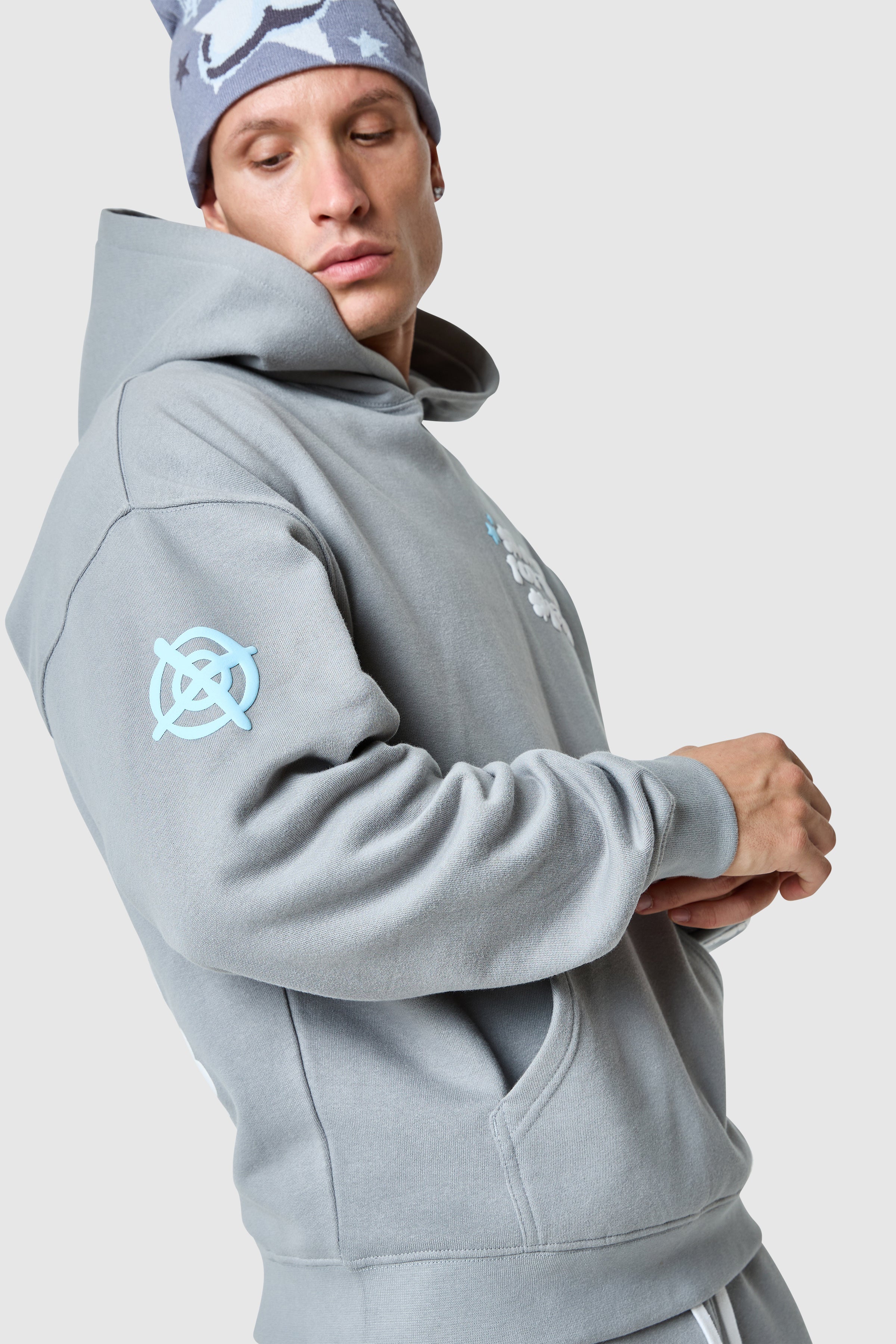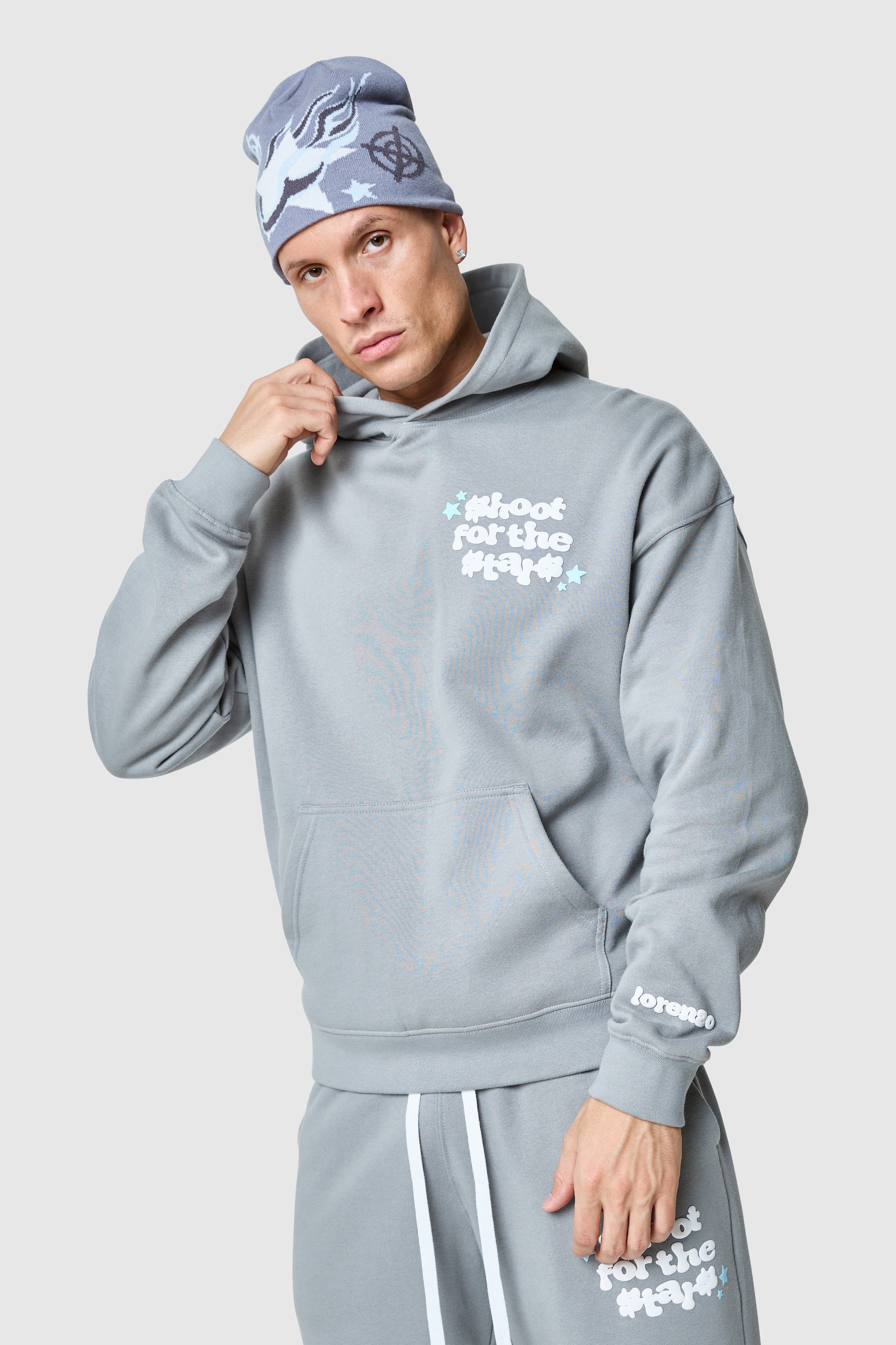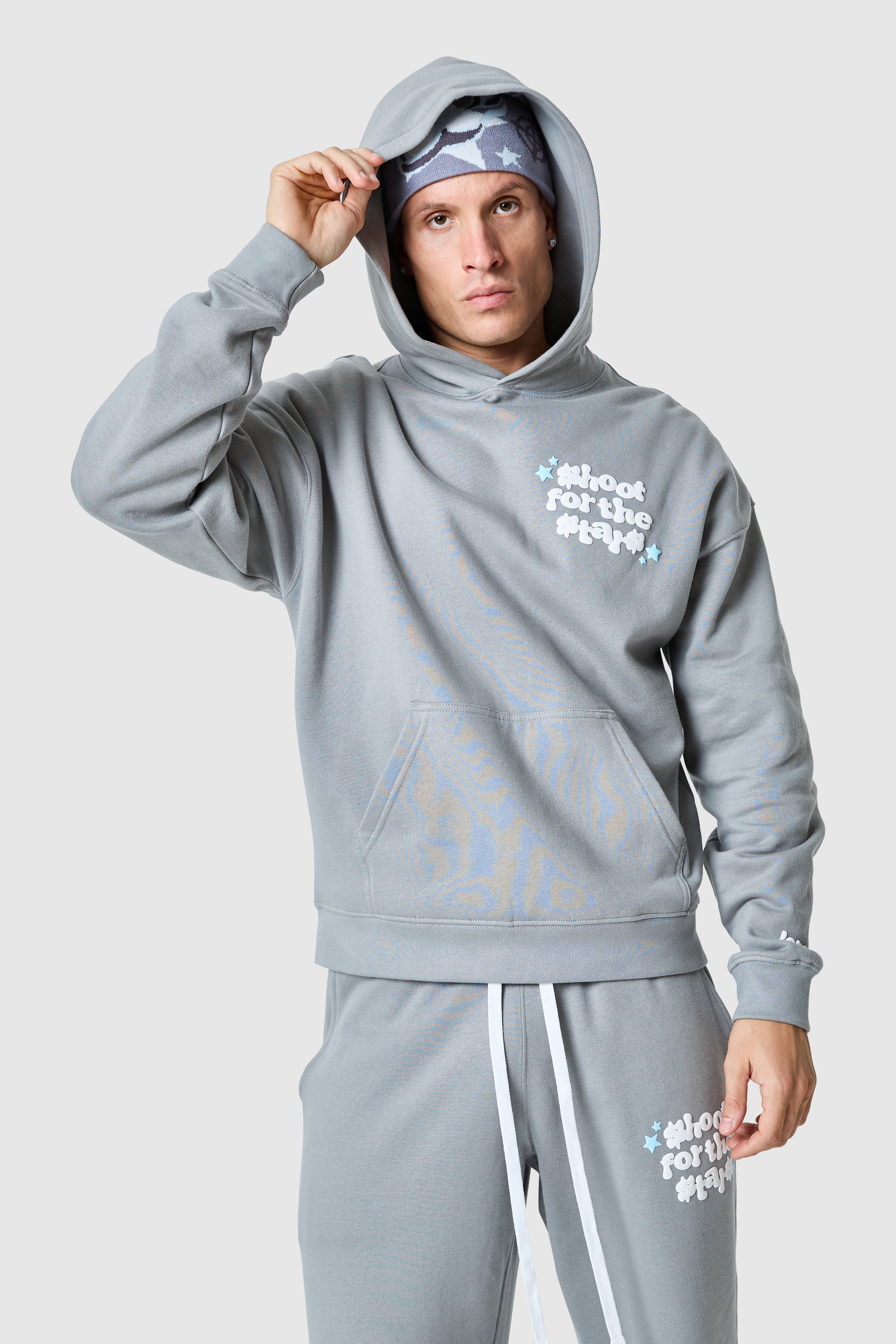 Introducing the Shoot For The Stars Hood. Featuring a bold graphic puff print and ribbed cuffs and hem, it pairs perfectly with the matching fleece jogger for a complete look.