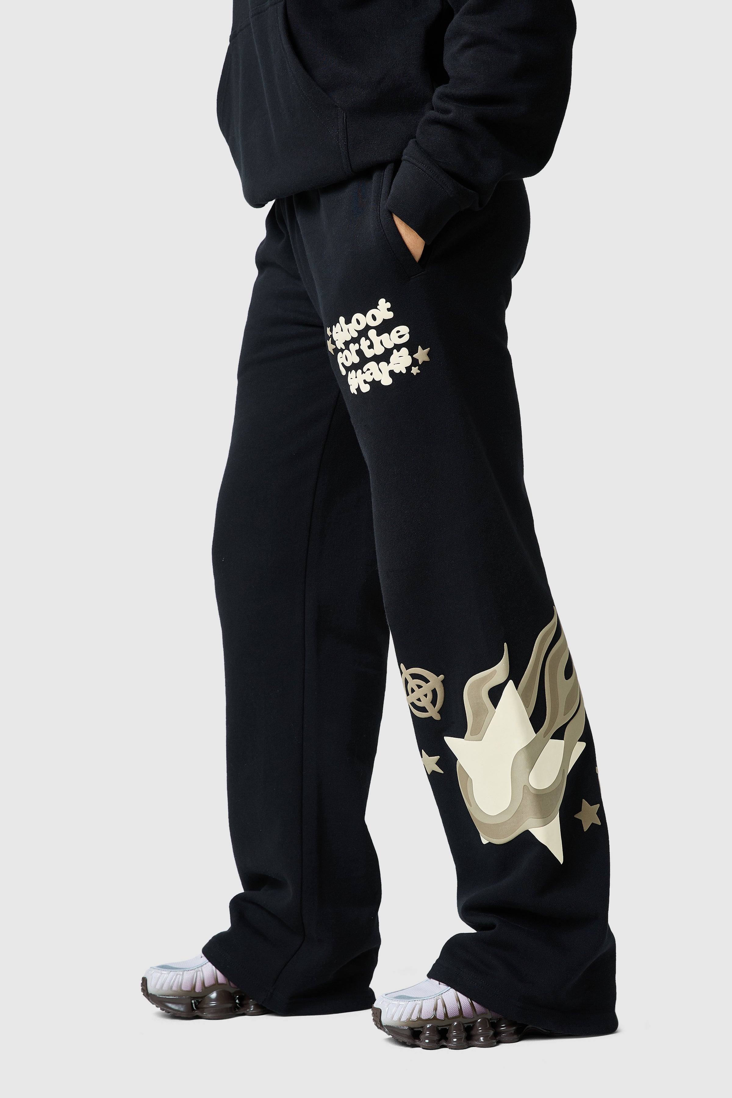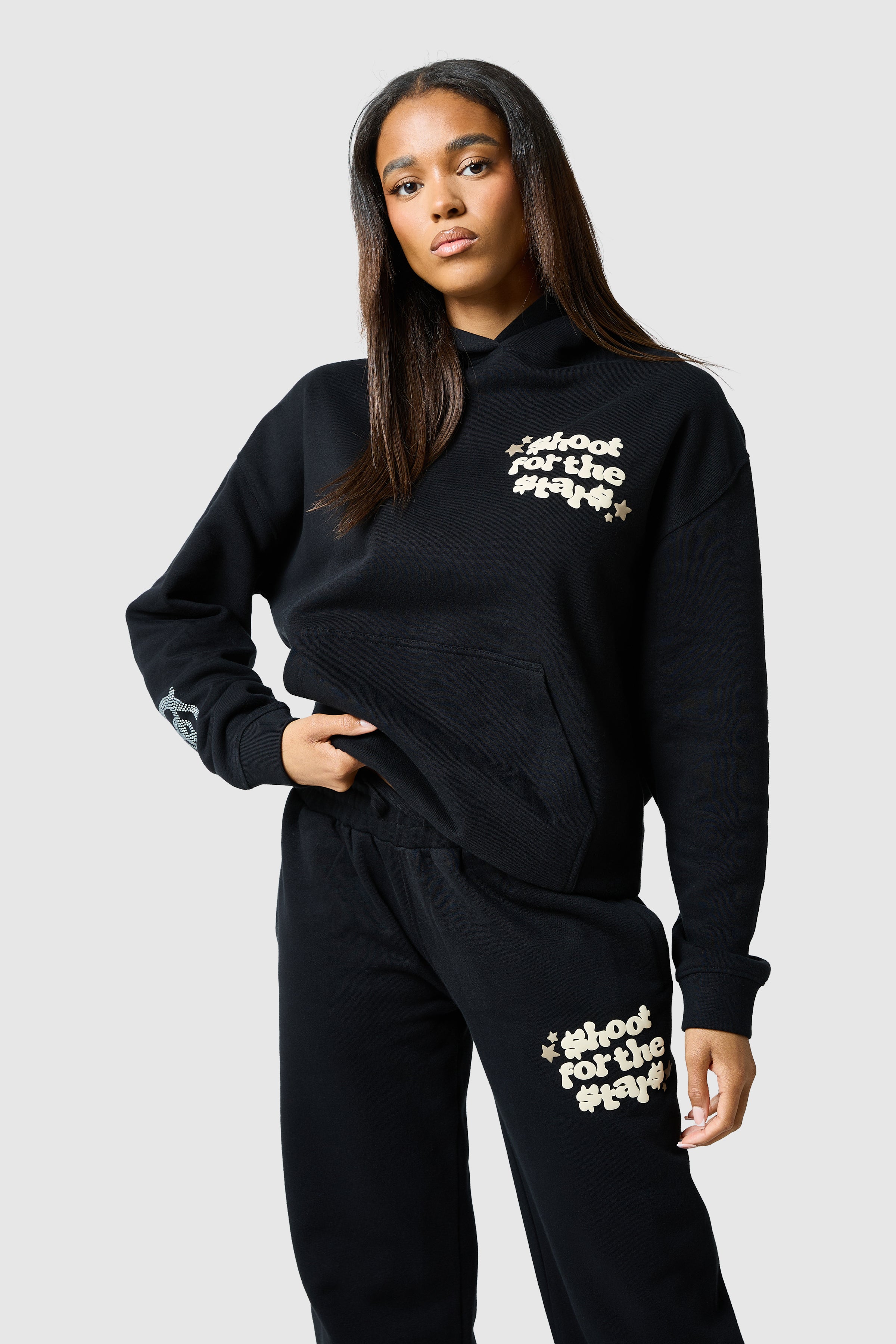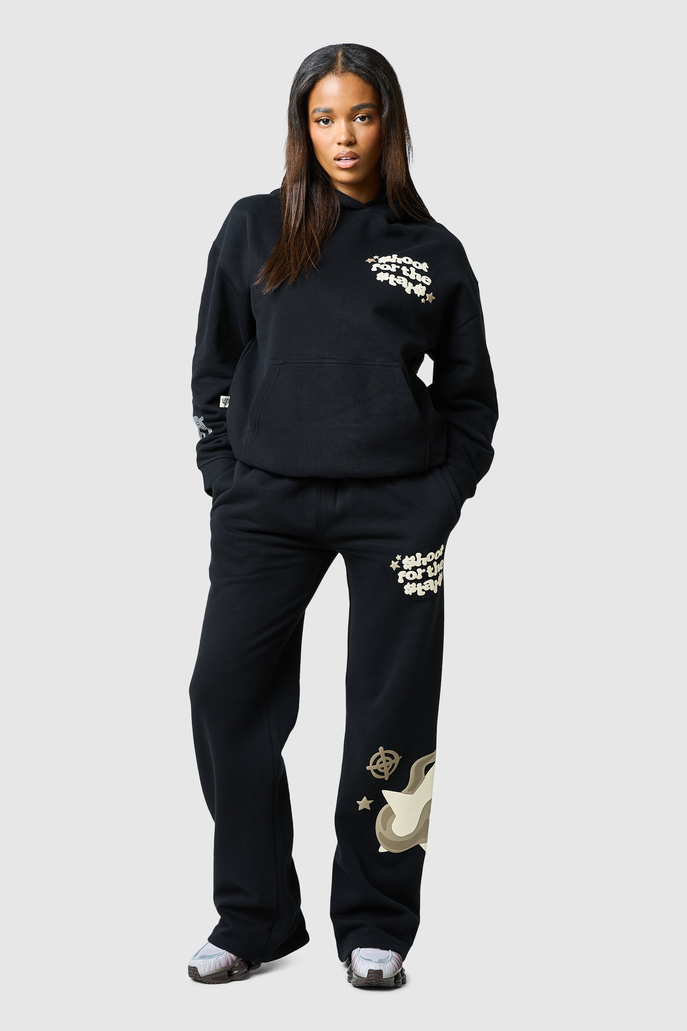 Introducing the Shoot For The Stars Tracksuit. Featuring a bold graphic puff print and ribbed cuffs and hem hood and a wide leg jogger, Shoot for the Stars is a new staple.